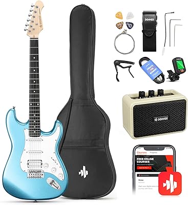 Donner DST-100T 39 Inch Electric Guitar Beginner Kit Solid Body Full Size Lake Blue HSS Pick Up for Starter, with Amplifier, Bag, Digital Tuner, Capo, Strap, String,Cable, Picks